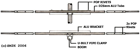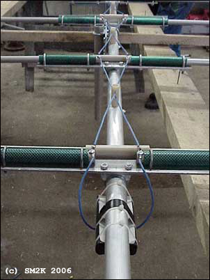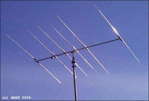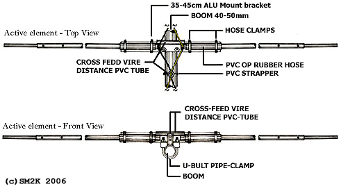 ![]() - LOGOSTAR 6 - ![]() LOGOSTAR6 in the sky, an most excellent antenna. - The "LOGOSTAR6" Antenna project - The idea to use an transpose / cross-feed system to feed the RF-Signal onto several matched driven elements is the "key" to this antenna design. - Why the LOGOSTAR6 - The idea to use several driven elements is an efficient way of getting optimum phasing of currents in the antenna for high gain and an excellent beam pattern. This idea also gives you broader bandwidth compared to a conventional Yagi as a bonus. The cross-feed system and the four matched drive elements, make this antenna excellent for CB-Radio DX from 26Mhz strait up to 28Mhz with less than 1:2 in SWR, without the need of any matching device (trans match o.e.) How does this work - You might ask?. The theory behind this antenna design is real easy, I try to explain the fundamental ideas for the design first. Number one: The RF-Signal on an specific frequency, example 26,5Mhz will automatically "prefer" to be emitted from the radial that is closest in match with the corresponding wavelength, in this case the longest driven element(Dr4) in the antenna construction. Calculation: (300/26,5)/2 = 5,66m (Actual lenght of Dr4 = 5,768m) Number two: The cross-feed system, feeds the RF-Signal with 180dgr off phase to the closest driven elements above and below in wavelength, this makes those element to act as parasite elements, this "phenomena" is caused by the fact that the cross-feed system, feeds the RF-Signal in the direct opposite phase to these elements. Considering these two easy to understand statements, we got an antenna that is forced to switch to the best drive element according to our chosen frequency! (Within the range of 26 to 28Mhz that is!) Is this FANTASTIC or what! And it realy works to! - Honors to the brains behind the theory - The "brains" behind... This antenna is designed using MS-DOS software "LOG-YAGI.EXE" version 1.6 by author Holger Granholm, OH0NC, Notice that this is shareware software, the registration fee is only $10.00us. The "LOGOSTAR6" antenna design is based upon the theory for the "Swan Yagi", The "Swan Yagi" was invented by Oliver Swan, W6KZK and first described by Ed Tilton, W1HDQ in QST 10/69. - History - I received the original drawing for this designe from a guy in Hilversum, Holland. I built the first one in about 1985, and used it with great satisfaction for several years. When i moved to a new QTH the antenna was put on the 'shelf' for a couple of years when i solde it to an radio-friend, i dont know if he newer used it. I got the great honer to build The second antenna for an werry enthusiastic DX-Friend. - The actual antenna design - ![]() Details - The Antenna Layout. ![]() Details - Dimensions / Balun connections. ![]() Details - Active element mounting bracket and cross-feed system - Top view - Building the antenna - I used an 40mm Dural-Aluminium tube as boom, the driven elements, the director and reflector is mounted on to the boom using one 50cm aluminum bracket and one U-bolt clamp for each element. The driven elements is insulated from the brackets with the PVC/Rubber hose, witch is cut into 20cm pices, the 40-50mm hose-clamps is used to tighten the driven element halfs onto the bracket. Distance (Gap) between the two element halfs on the driven elements is about 7.5cm at the center. The director and reflector is POP-Riveted direct to the bracket, no insulation is needed in this case. ![]() Details - Reflector and director element mounting bracket - Top view - Tuning the elements - If you measure the driven elements halfs carefully, no additional tuning is needed. This makes it possible to simply POP-Rivet the 25mm and 16mm parts for the element halfs together permanent. This is also the case for the complete director and reflector elements. - Technical data - Characteristics and performance. Operating Frequency Range 26 - 28.000 Mhz SWR less then: 1:1.8 High Frequency Center 27.500 Mhz SWR 1:1 High Frequency limit 28.200 Mhz SWR 1:2.3 Low Frequency Center 26.300 Mhz SWR 1:1 Low Frequency limit 25.800 Mhz SWR 1:2.2 Forward Gain 11.3 dBD Front / Back rejection ratio Better than 40 dB Front / Side rejection ratio Better than 25 dB - Images - ![]() The Cross-Feed System... ![]() The Balun underneath the boom <-- Go Back! ![]() ©1999/2000/2001/2002 SM2YER Goran |