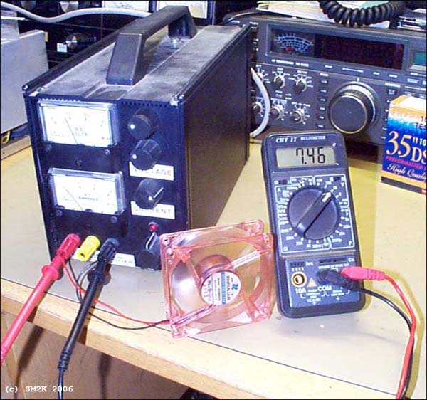 ![]() Fan 'Speed-Lab' Setup - 1. Determine voltage level for the FAN - I start at the FAN's normal voltage (normaly 12V) and reduce voltage until i notice a drop in noice level's, this should be about 20-30% from full speed. The voltage is then normaly 7-9 volt. - 2. Calculate the resistor value - In this case the desired FAN voltage is 7.5volt, given that the FAN's normal voltage is 12volt we need to make a voltage devider that reduces the volt with 12-7,5 = 4,5volt. In order to calculate the value for the resistor we also need to know the FAN's current drain, this is normaly stated on the label on the FAN, if not you may need to make an aditional lab to meassure the current. I get the current value for my FAN from the label, it's 0,12A.