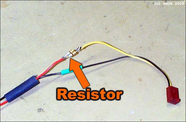 - 3. Mount the speed reduction resistors - The resistors need to be able to handle about 1/2Watt power, i often use two 1/4watt resistors in parallel. (This is not important) Use whatever resistor you got your hands on. (Carbon or metalfil is OK!) as long as the value is correct or as close as possible. I cut away about 1cm - strip and pre-solder the (+ Lead) Red or Yellow FAN-Lead, i leave the other one (or two)(Mostly Black and green). I use heat-shrinking insulation tubes to insulate when the soldering part is finished. ![]() This image show how i solder the extra resistor to FAN-Lead. ![]() Completed! CPU-FAN Resistor i place - 4. Testing - Conclusion This image show how i solder the extra resistor to FAN-Lead. <-- Go Back! ![]() ©1999/2000/2001/2002 SM2YER Goran |