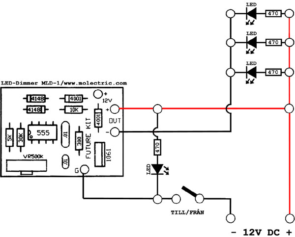 Använder kabelförskruvningarna tillsammans med kontramutter (ELFA Artnr: 55-024-55). Har tätat dessa med epoxi lim och monterad med avstånd c/c 20cm i kabelkanal Torsman 20x40mm. - Använder även förkopplingsmotstånd på 470ohm 1/4Watt (1st per LED) ![]() Kabelförskruvning 55-023-60 För LED-Belysningen ovanför bastu kamin har jag använt rostfria LED hållare från http://www.molectric.se/ Artnr: MBL5-1 - Använder även förkopplingsmotstånd på 470ohm 1/4Watt (1st per LED) ![]() Bastulins MBL5-1 - LED Regulator - (Dimmer) Köpte en färdigbyggd LED-Regulator 'MLD-1' från http://www.molectric.se/ och byggde in den i en standard IP54 kopplingsbox. Regulatorn gör att belysningen kan regleras nästan ner till noll (ca 10-100%) ![]() LED-Styrning / Kapsling ![]() LED-Styrning / Öppnad ![]() Transformator och 12V inkoppling ![]() Kopplings-schema - Länkar - http://www.molectric.se/ http://www.ydcircuit.se/iframe.php?s=omled Go Back! ![]() ©1999-2006 SM2YER Goran |
