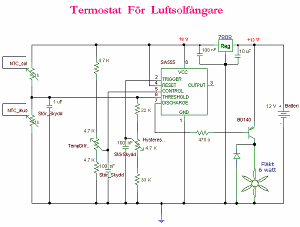 ![]() - Differential termostat - 2009.04.05 Försök / beskrivning med differential termostat. Kretsen bygger på räknar ![]() Krets-schema Material / Komponenter ============================================== 2st Resistor 1/4W 4K7 1st Resistor 1/4W 33K 1st Resistor 1/4W 22K 1st Resistor 1/4W 470 3st Kondensator 100nF 1st Kondensator 1uF 1st Kondensator 10uF 1st Diod 1N4148 2st Trimpot PT15NV15 4K7 ELFA nr# 64-395-58 1st Regulator TS7808CI ELFA nr# 73-000-32 2st NTC resistor 1K ELFA nr# 60-259-69 1st Timerkrets SA555P DIL8 ELFA nr# 73-041-17 1st Transistor BD140 ELFA nr# 71-042-35 1st Tryckt kretskort ============================================== - Honors to the brains behind... - Som vanligt så har jag hittat det mesta här ute på internet. Här är några länkar till mina inspirations källor / Referens material: Go Back! ![]() ©1999-2006 SM2YER Goran |