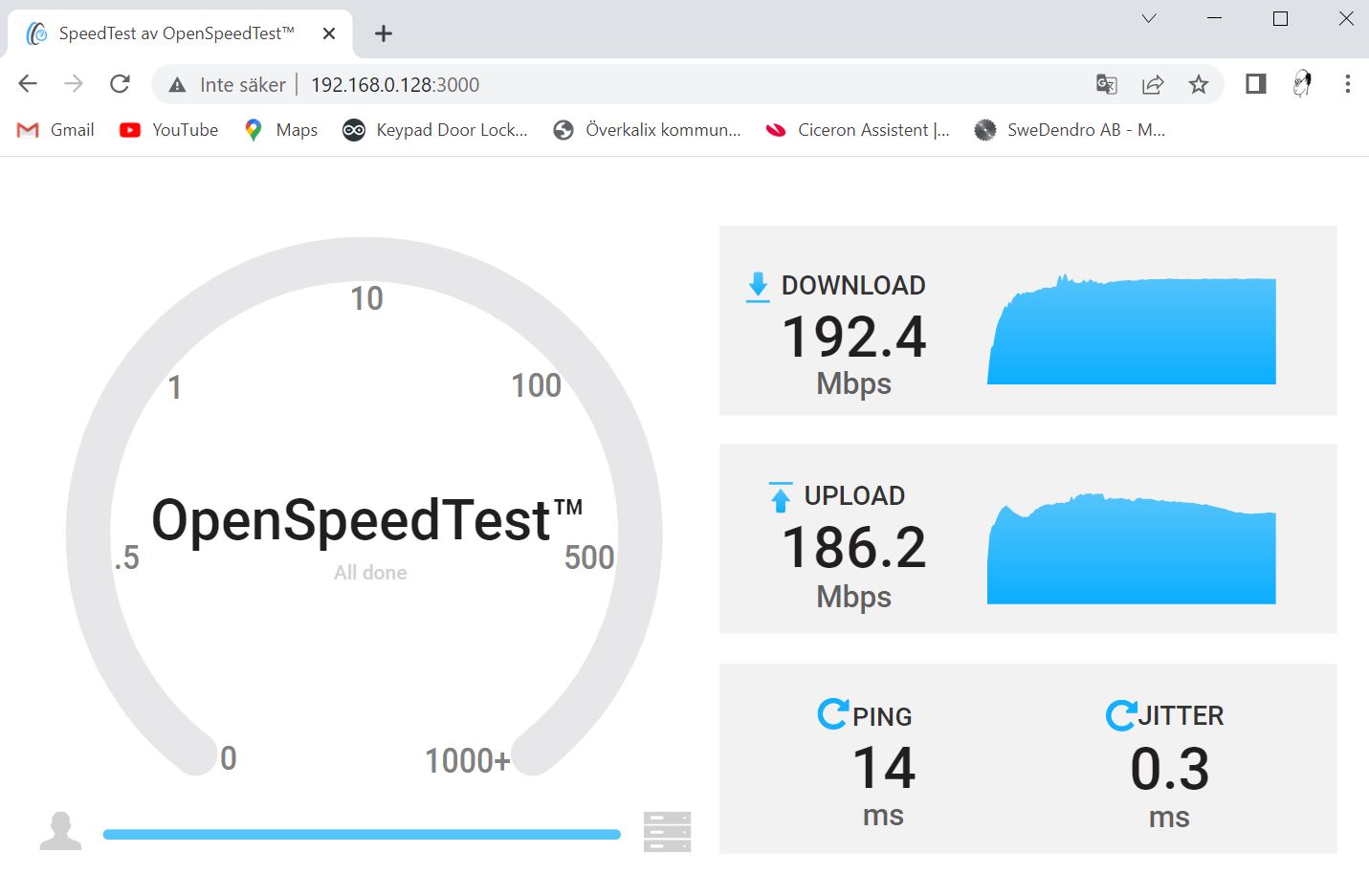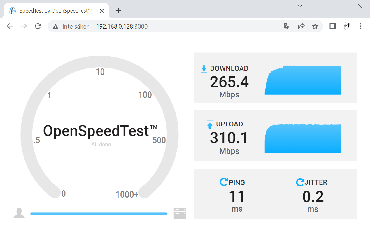Normal test setup The 'OpenSpeedTest™-Server' (1) is connected to 1Gb LAN with cat6 cable, and the client computer (2) connects via USB.v3 to WiFi6 network using the Plexgear® USB AX1800 dongle. Test setup ![]() OpenSpeedTest™-server on ROCK-4SE / RPI-4SE with case Latest test results 2023.05.18 Test1--Test3 is done on my private home network. Test 1 & 3 is both made on my WiFi network, there is a significant difference in test results. Can't see any obvious reason for this.... Test 1. 'OpenSpeedTest™-Server' on 1Gb LAN connection / Client = Windows 10 computer on IEEE.802.11ac standard WiFi connection Test 1. Test 2. 'OpenSpeedTest™-Server' on 1Gb LAN-cable connection / Client = Windows 10 computer also on 1Gb LAN-Cable connection. Test 2. Test 3. 'OpenSpeedTest™-Server' on 1Gb LAN-cable connection / Client = Windows 10 / LENOVO THINKPAD X1 TABLET core i7 computer on IEEE.802.11ac standard WiFi connection. Internal 'Intel® Dual Band Wireless-AC 8265' WiFi card. Test 3. Länkar / referenser Honors to the brains behind - 'Äras den som äras bör' - som talesättet säger. Som vanligt så är det inte jag som kommit på allt detta. Här hittar ni länkar till referenser och leverantörer. [R1] OpenSpeedTest @ openspeedtest.com [R2] OpenSpeedTest @ github.com [R3] About MIT License @ wikipedia.org [R4] https://wiki.radxa.com/Rock4/downloads [R5] https://wiki.radxa.com/Rockpi4/Ubuntu [R6] https://snapcraft.io/install/openspeedtest-server/raspbian [L1] Datortillbehör @ kjell.com [L2] n.nu 'Disclaimer' The information given on this page is given on an 'As Is' basis and aimed for NON COMMERCIAL use only. The author can not be held responsible for any use of the information. Any registered product / trademark or company name on the page is the property of their respective owners. Notera! Det är helt personliga reflektioner och upplevelser vi skriver om på den här sidan, dessa är inte några 'Expert' kommentarer / utlåtanden. Vi rekommenderar INTE att någon ska göra dom ändringar / Modifieringar som vi gjort och som beskrivs på denna sida, då dessa HELT SÄKERT gör att alla garantier som leverantören utställt OMEDELBART upphör. Våra tester och slutsatser kan INTE, och ska INTE tas för intäkt att samma eller motsvarande resultat eller upplevelse kan erhållas eller efterliknas någon annanstans eller av någon annan. <-- Go Back! ![]() ©1999--2023 SM2YER Goran |
