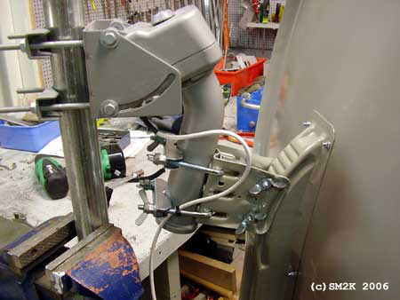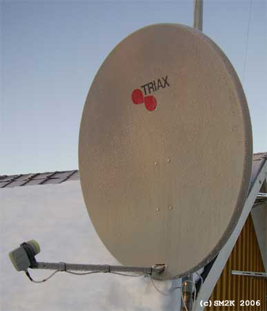 - Offset parabolic dish with Polarmount / Motor - These images is taken indoors when i pre installed the motor and dish. ![]() 110cm 'TRIAX' TDS-110 Offset steel parabolic dish TECHNICAL SPECIFICATION ================================= EAN-nummer ............... 5702661229015 Storlek .................. 100 x 105 cm Färg ..................... Grå [ral 7035] Frekvensområde ........... 10.7 - 12.75 GHz Förstärkning vid 11.7GHz . 40.2 dBi G/T LNB 0.7dB ............ 20.6 dB/K X polarisering ........... > 27 dB Offset vinkel ............ 26 Grader Elevations område ........ 10-50/45-80 Grader Reflektionstyp ........... Offset Öpningsvinkel ............ 1.8 Grader Vindlast @42m/s .......... 1222 N Material ................. Galvanised steel Färdig ................... Polyester powder coat LNB hållare .............. ø40 + ø25 Mast dimension ........... ø 32-60 mm Vägg beslag .............. - optional extra Standards ................ ETS 300784 ![]() 'Superjack DG-120' DiSEqC 1.2 Polarmount/Motor