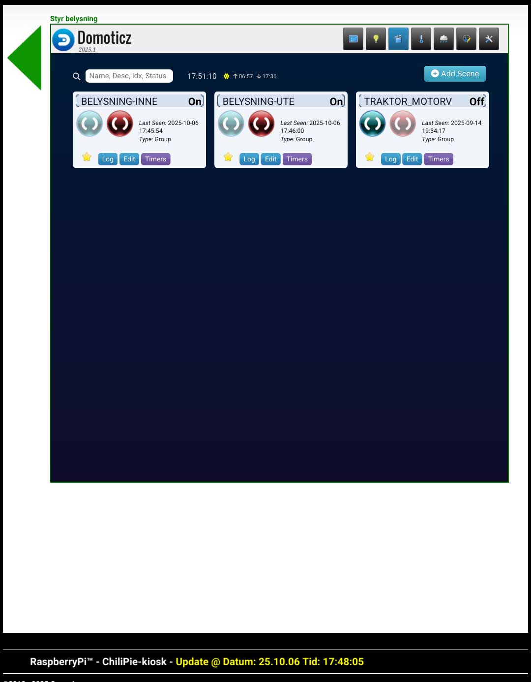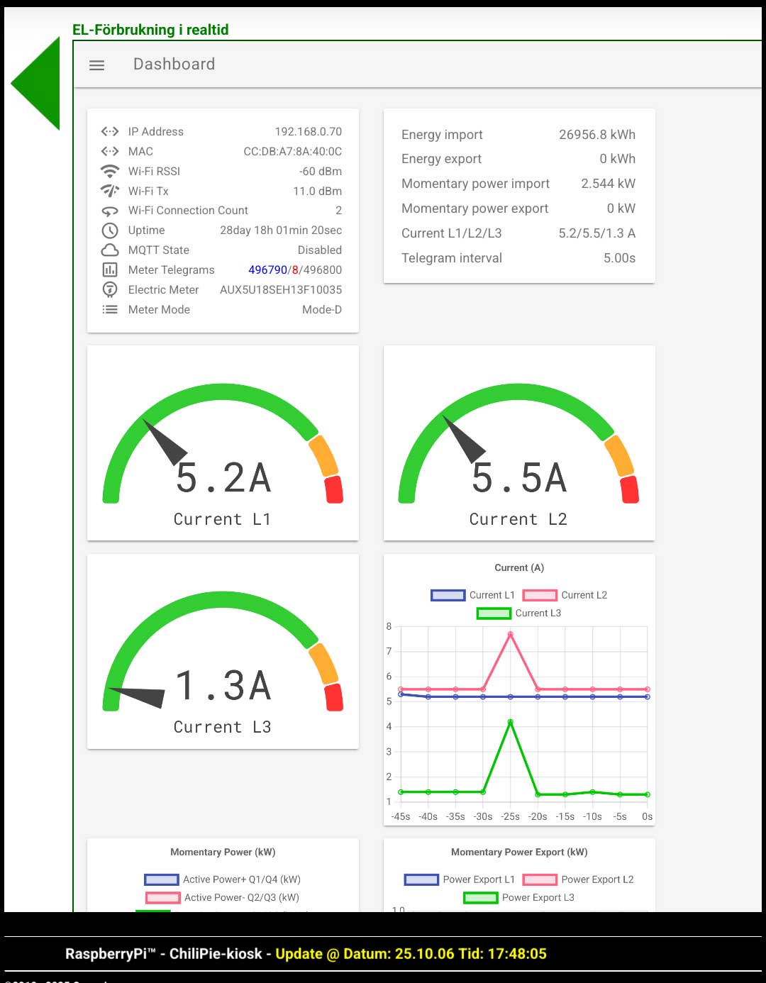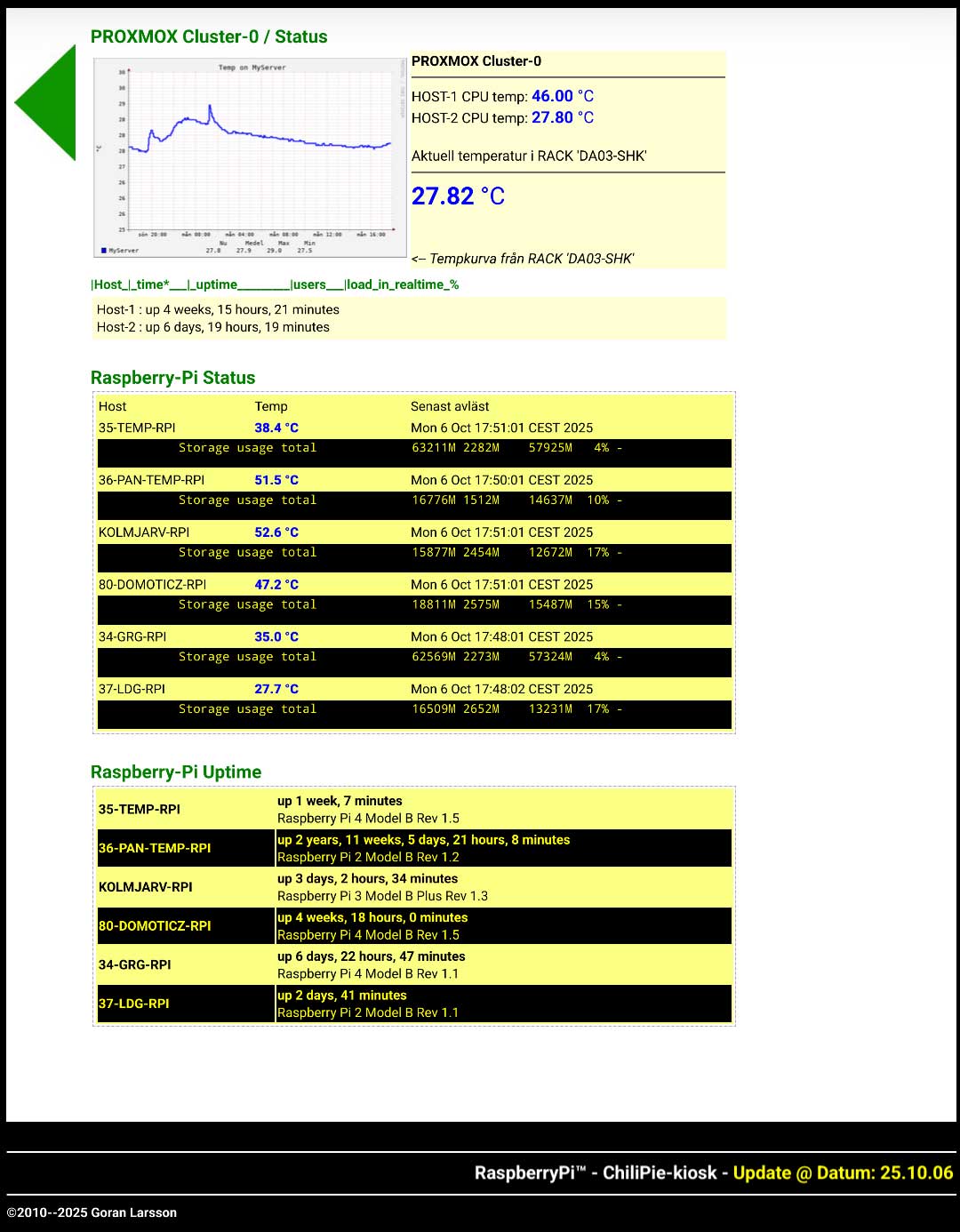 Senast uppdaterat 2025.10.09 Kiosk RPI datorn är nu uppe och igång, fick lite problem med att rotera touch-skärmen, hittade lösningen på: https://forums.raspberrypi.com/viewtopic.php?f=108&t=166959&p=1442370&hilit=xinput#p1442370 Kontrollerar vilket OS som ligger i grunden för chilipie-kiosk avbildningen, använder cli kommando: 'cat /etc/os-release' (alt. 'lsb_release -a' eller 'hostnamectl') påbörjar montering & installation av våran nya kiosk terminal, inser att en 7" skärm inte är så förskräckligt stor, kollar nu på en 10,1" skärm. ![]() Raspberry-Pi monterad på baksidan av touch-skärmen. 2025.10.04 Bildskärmen är beställd via Amazon.com[L1], Raspberry Pi 4'an är 'återvunnen' från tidigare projekt då många av mina Raspberry-Pi datorer nu har ersatts av virtuella maskiner i våran 'PROXMOX' virtualiseringsmiljö. ![]() 7" Touch screen framsida / baksida Jämfört med tidigare kiosk installation så kommer vi nu även att kunna övervaka bl.a. temperaturer och energi förbrukning m.m. - styr även fönster belysning och belysning utomhus. Har även lagt in övervakning av temperatur ute i frysboxen. ![]() Skärmdump från kiosk / startsida / Server status ![]() Skärmdump från kiosk / energiförbrukning / Belysning Layout / Funktion på föregående kiosk installation ligger --> Här! ToDo Som dom flesta 'projekt' så är där alltid något som kan göras bättre / annorlunda eller ändras lite på... Beskrivning Kostnad Sammanställer kostnader t.o.m. 2025.10.04