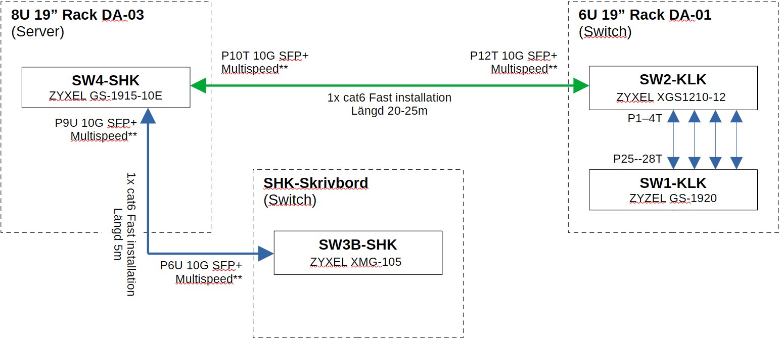 Nu är det så att där bara är en fast installerad cat6 kabel (Grön pil på nät-skiss nedan), ca 20-25m lång mellan vårat rack (DA-01) där huvud-switch och internet anslutning finns och upp till mitt radio-shack (DA-03) där min server virtualisering bor.