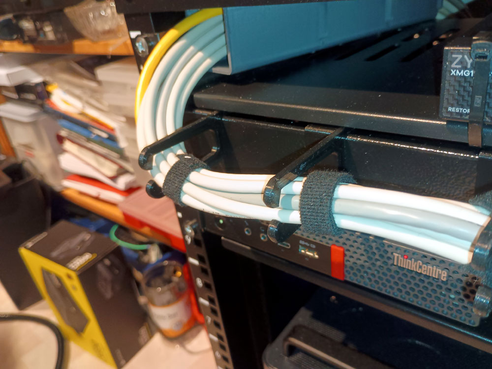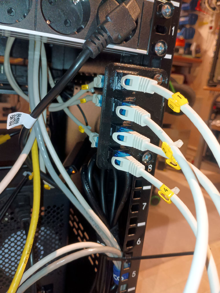2026.01.24 Skissar i 'SketchUp' och 3D-printar en liten 4port patch-panel, skruvar den i bak-kant på vårat 12U server-rack, kopplar till den nya vägg boxen med 4st 2meters cat6 kablar. Använder samma RJ45 Cat6 kopplingsstycken som används i väggboxarna.
