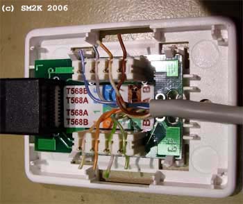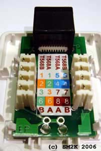 - This page is under construction... - - Physical installation of a Ethernet LAN - On this page i try to describe howto make your Ethernet LAN installation. In my work i also supervise and maintain many different both Physical and Logical LAN's. (LAN/VLAN) I also work with routing and switching techniques ![]() Ethernet cable - UTP ![]() RJ45 (Modular) external Ethernet Outlet ![]() Tools Material - list ================================== 1. Installation cable Unshielded Twisted Pair (UTP) Cat 5e / Cat 6 with solid cu-wire x8 2. Patch panel 3. RJ45 (Modular) Ethernet Outlets 4. Sutable (5mm) Cable clamps or cable staples 5. A Cordless Power drill and drills Tools - list ================================== 1. Modular tool (KRONE) 2. Sharp knife 3. cable cutter 4. screwdriver 5. cable staple gun (If possible)- Layout - First you need to find a suitable location for your 'LAN-Central' - It's preferred that it is placed as central as possible in your house or flat. Maby close to a stairway or in a closet in your hallway is a good location. Is is from this central al your cables is going out to your different Ethernet Outlets. ![]() The 'LAN-Central' switch/router - Cable Installation - ![]() Stapled cables and two Ethernet outlets in my garage - Wire Connections - When the cables is in place, it's time to connect al the Ethernet Outlets and the Patch-Panel. Connect the wires inside each Ethernet Outlet, using the modular tool (KRONE-Tool) and the 'T568B' color markings. Follow the steps 1 to 4, as shown by the images below. Also Take a look at the Patch panel installation, you find some nice information. ![]() color markings inside the Ethernet Outlet ![]() 1. Strip about 30mm from the outer jacket and spread the 8 wires as shown in the image above. ![]() 2. Place each of the 8 wires according to the 'T568B' color markings. ![]() 3a. Using the modular tool (KRONE-Tool) puch down each wire in place. ![]() 3b. the excess wires is automatically cut. ![]() 4. Closeup on finished connection. My Local Area Network (LAN) Physical installation of a Ethernet LAN (This Page!) WAN Connection Capacity Test. My Server@Home *** End of page *** <-- Go Back!