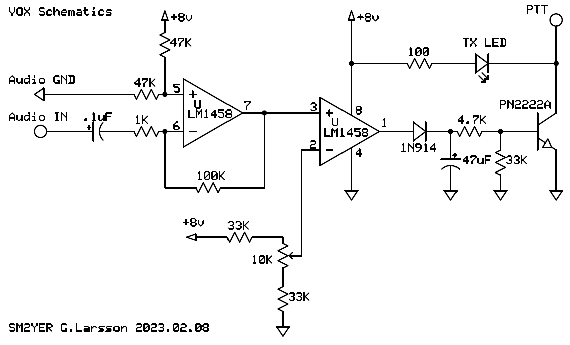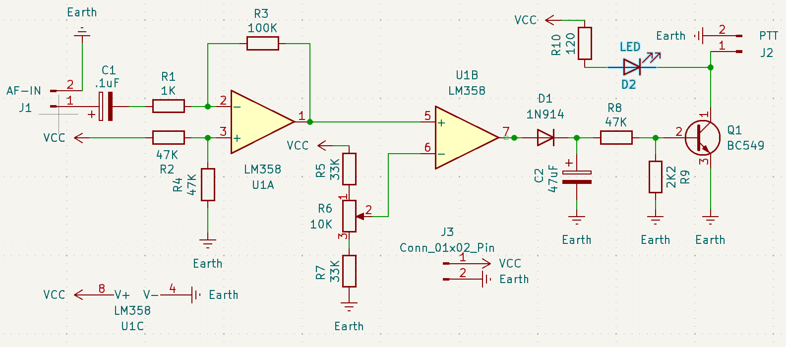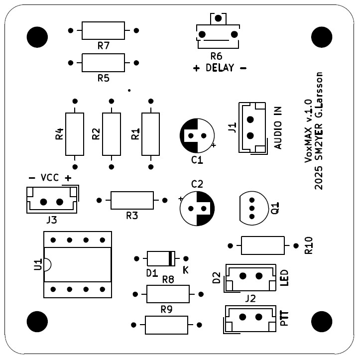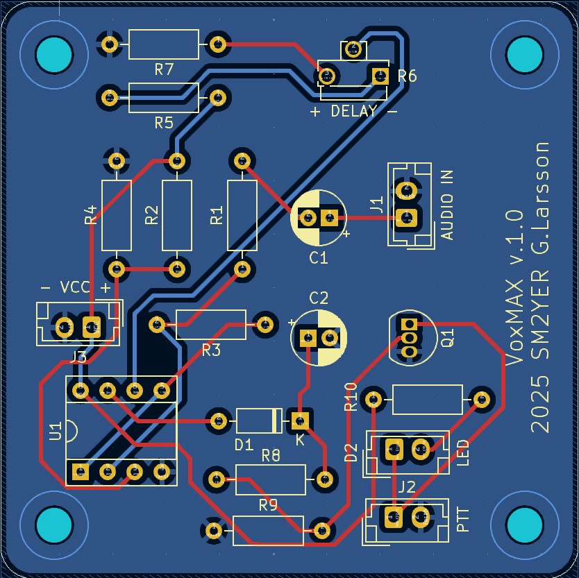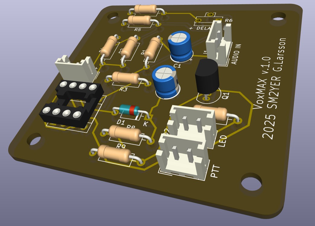 Senast uppdaterat 2025.10.31 Ritar krets-schema och PCB-Layout i 'KiCAD'[R2] - Notera: Dual OP-Amp krets (U1A/B) 1458 kan ersättas med LM358, transistor (Q1) 2N2222A kan ersättas med BC549, dessa ska i princip vara helt kompatibla. ![]() Krets-Schema från KiCAD ![]() PCB layout från KiCAD Notera att kretskortet är designat för att sitta 'piggyback' ovanpå PTT/Ljud delen av DigiMAG v.2 kortet, detta när man av någon anledning behöver trigga TX på sin radio med 'VOX' i stället för via C-IV eller DTR/RTS på en COM-Port. På DigiMAG v.2 kortet sitter en extra ljud utgång 'VOX-EXP' förberett för VoxMAX v.1.0. expansionen. ToDo Som dom flesta 'projekt' så är där alltid något som kan göras bättre / annorlunda eller ändras lite på... Beskrivning ![]() Komponent layout från KiCAD Inkoppling / Inställning J1 AUDIO IN - Ljudingång från mic / dator eller DigiMAX v.2, Pin1 = Signal / Pin2 = Jord-skärm. J2 PTT - PTT (Sänd) anslutning till radio, Pin1 = PTT / Pin2 = Jord-skärm. J3 VCC - Strömförsörjning 10-30VDC (Likspänning), Pin1 = Positiv / Pin2 = Negativ. D2 PTT-LED - Anslutning av LED för indikering, Pin1 = Positiv / Pin2 = Negativ. Kostnad Sammanställer kostnader t.o.m. 2025.03.14