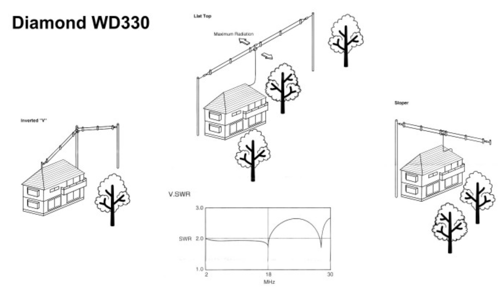 Senast uppdaterat 2023.11.05 Har precis inhandlat en ny DANNEX FRA1530A bredbandsdipol - Tanken är att WD-330J antennen då ska få flytta till vårat sommar-QTH, då blir det möjligt att vara igång på 80M--10M HF band därifrån också!. 2023.10.26 Använder antennen när jag kör ALE (Automatic Link Establishment) med 'hoppfrekvens'. Du kan läsa mera om ALE / SWALE -->Här! 2023.10.29 Kontrollmäter SWR på alla antenner efter att allt varit bortkopplat under sommarens måleri-arbeten. ![]() SWR kurva 2-30MHz SWR mätning i .pdf format -->Här! ToDo Som dom flesta 'projekt' så är där alltid något som kan göras bättre / annorlunda eller ändras lite på... Beskrivning Diamond WD-330J är en vikt dipol (Typ T2FD antenn), det är en väldigt vanlig / enkel antenntyp. Antennen blir väldigt bredbandig, den blir dock något mindre effektiv i jämförelse med en anstämd öppen (vanlig) dipol på respektive band. I praktiken går den att använda på vilken frekvens som helst 3,5--30MHz utan avstämning. Det gör den ytterst lämplig om man t.ex. ska köra ALE (SWALE) med frekvenshopp inom flera olika våglängder/band. Diamond WD-330J