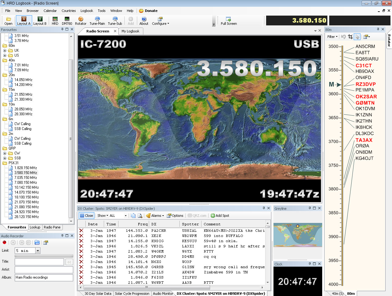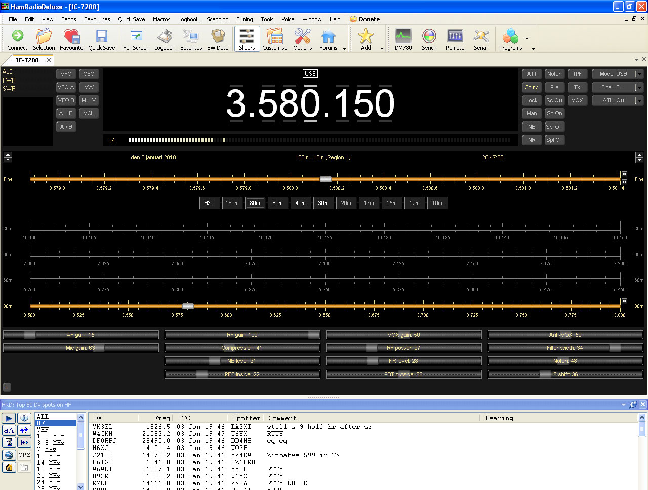 ![]() - Tranceiver ICOM IC-7200 - 2010.12.31 The rig is SOLD! - Due to lack of interest at present time. 2010.01.03 Now also testing the USB Rig/Radio built in interface. No problems to controle the radio from PC using HRD 5.0 Build 2434 Beta - This version got the IC-7200 in the radio selection list ;-) Nice! - Almost any function on the radio is accessible from the PC software. The baud rate and CI-V address is set in the same manner as before in the radio setup menu and selected accordingly in the software. ![]() Click on image to enlarge! Also trying to get sound in/out via the USB cable for PSK usage, no problems. Listening in 3580,150 KHz, lot's of stations heard. ![]() Click on image to enlarge! ![]() Click on image to enlarge! 2009.12.04 First look. The rig is quite easy to start with. The 'Quick SET' function is nice. Simply press 'SET' and the most used settings is at your hand. Most other settings is also easy to access simply by pressing and holding any button. s.a. Setting compressor level, simply press anh hold 'COMP' button. One disadvantage i discovered up to now is that there is no FM Mode on this one, i missed this when reading specifications prior to buing it. There is also only one antenna connector (No internal antenna selector) ![]() ICOM Tranceiver IC-7200 - Front view ![]() ICOM Tranceiver IC-7200 - Side view ![]() ICOM Tranceiver IC-7200 - Back view - Documentation - - Technical data -