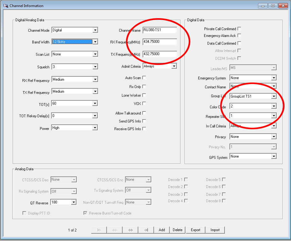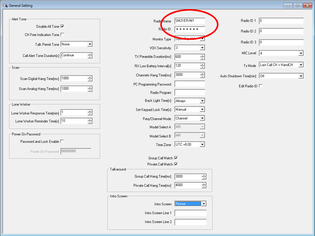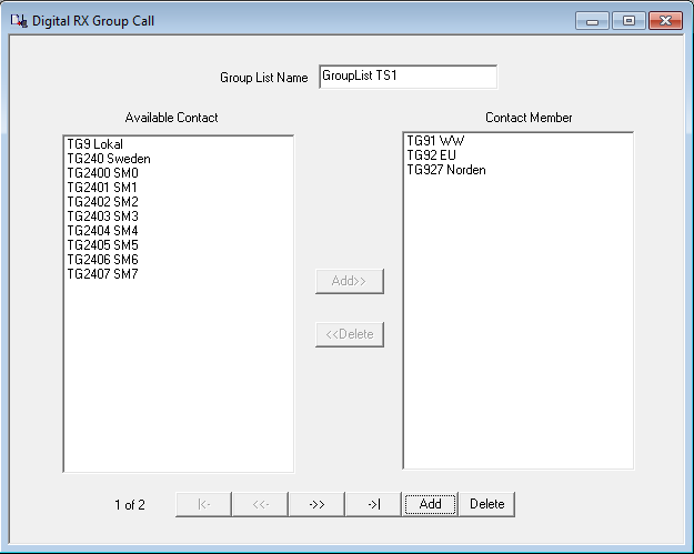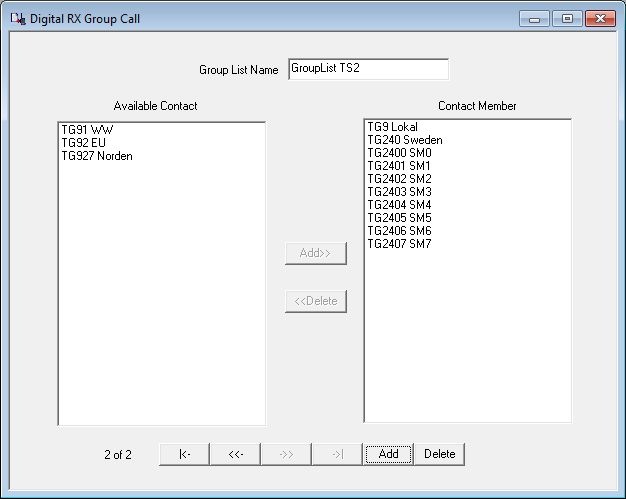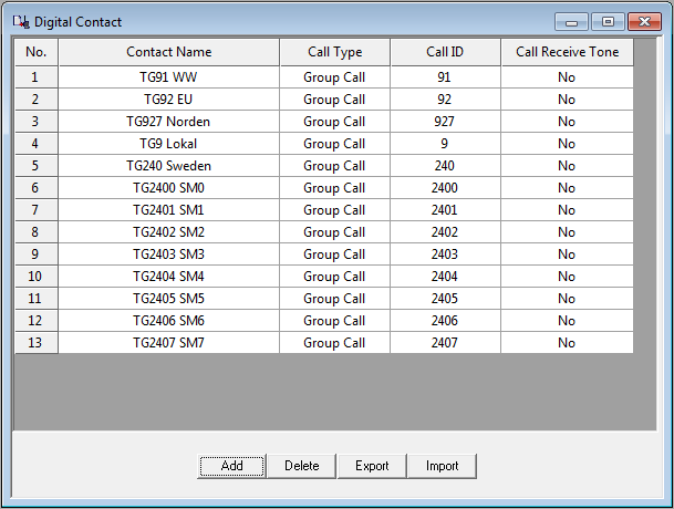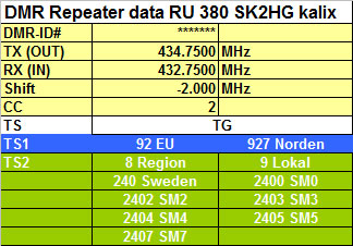 Förutom detta behöver jag även programvara, programmerings kabel samt en del radio data. Testar lite med prg. vara för TYT (Tytera) MD9600 - Fick inte prg. vara för RETEVIS RT90 att fungera (Borde fungerar ändå då dessa två i grunden är samma radio). Börjar med att välja vilken typ av radio du har, frekvensområden o.d. (Om du ändrar här efteråt, så nollställs allt du skrivit in i andra delar, Jobbigt!) - Fortsätt sedan med 'general' data = Radio ID, call o.s.v. General settings Så är det dax för kontakt listan, här lägger jag in en kontakt per talgrupp (TG) och direkt DMR-ID nummer om man vill ha direkt kontakt med någon. Kontaktlista Sedan gör jag en RX lista per Timeslot (två för varje repeater om man inte vill använda samma) - I 'Grouplist TS1' för TS1 lägger jag in dom talgrupper (TG) som ligger i TS1 på repeatern. RX Lista för TS1 I 'Grouplist TS2' för TS2 lägger jag in dom talgrupper (TG) som ligger i TS2 på repeatern. (Ser att jag missat att lägga in TG8 som är våran regionala talgrupp...) RX lista för TS2 Till sist skapar jag en digital kanal per timeslot för respektive DMR repeater, anger frekvenser, Timeslot, colorcode, callist o.s.v. Config för ch1/TS1 Config för ch2/TS2 Lägger även in en del lokala (Analoga) repeatrar, det är mera rakt på (Som förr i världen)
