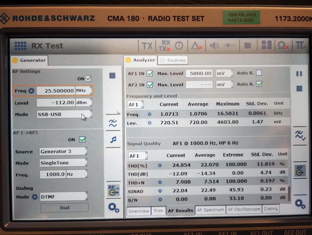 2025.04.23 Testar signalmätaren, den ska visa S0 vid -110dBm, S5 vid -97dBm och S9 vid -73dBm, den verkar att stämma någorlunda, visar lite för lågt i början av skalan och lite för högt i övre delen av skalan.