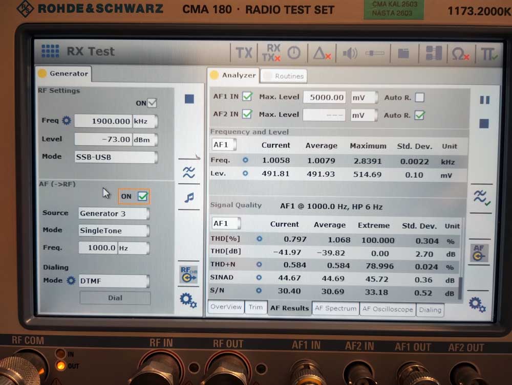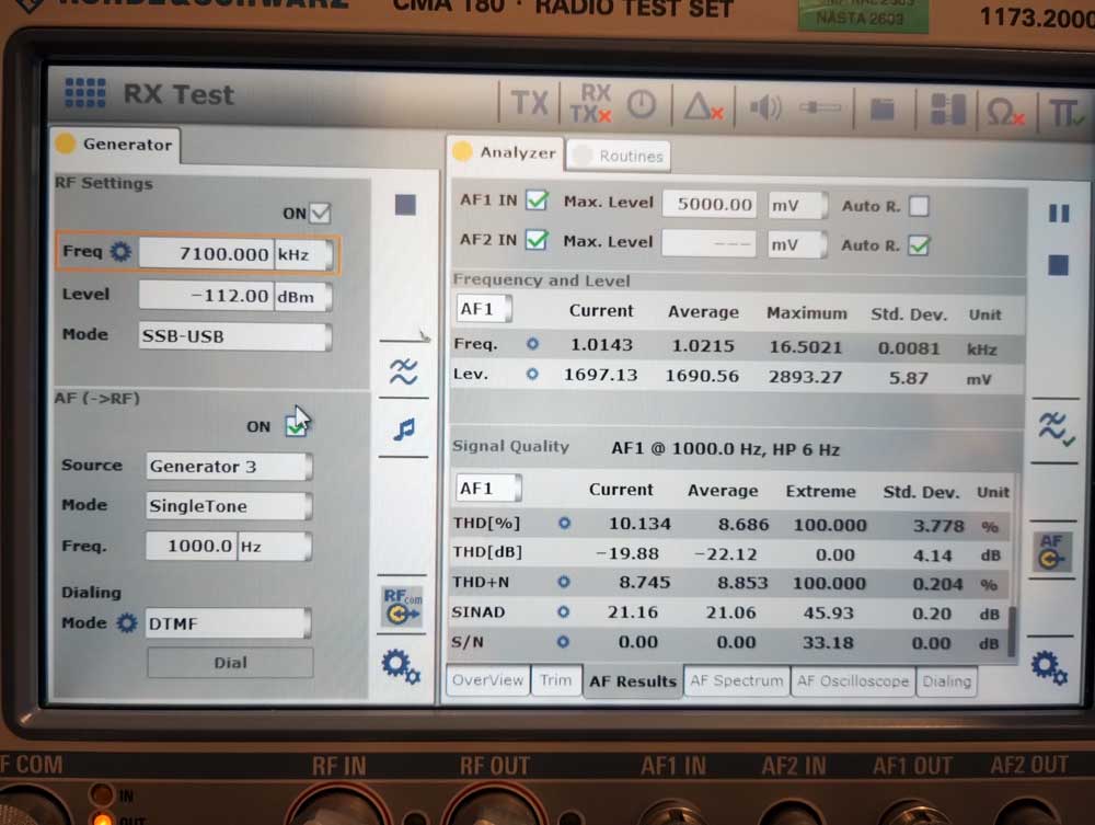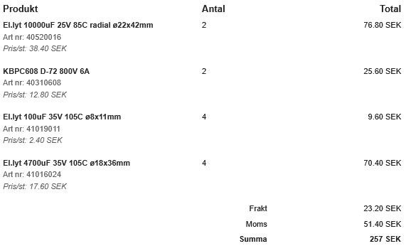 Testar mottagarens känslighet, Resultat >20dBm SINAD vid -112dBm input (Enl. manualen ska känsligheten vara >10dB S+N/N vid 1uV insignal) ![]() Test @ 1,9MHz / 2,9MHz / 7,1MHz ![]() Test @ 10,5Mz / 14,2MHz / 25,5MHz 2025.04.20 Så var det roliga slut, lossade frontpanelen och drog fast RF/AF gain potentiometern, skruvade tillbaka frontpanel och alla rattar, skruvade på botten / topp höljet. Testar radion under kvällen, och allt verkar nu att vara OK! ![]() ICOM IC-R71E fram / baksida ![]() ICOM IC-R71E Från vänster / Från höger ![]() ICOM IC-R71E ovan / undersida Tar med radion på jobbet där vi har utrustning för att testa känslighet / selektivitet m.m. 2025.04.21 Lyssnar på Finska contest stationer på 40M / LSB, jämför frekvens och signal styrka med min 'YEASU FT-710 AESS' radio - Signalstyrkan ändras (sjunker) marginellt och frekvensen ligger exakt samma. Måste medge att ljudbilden är väldigt klar och tydlig, bakgrundsbruset t.o.m. aningen lägre enligt vad jag kan uppfatta med mina öron. 2025.04.12 Har uppgraderat nätdelen (REG UNIT) - Har lött om ALLA lödningar på kortet + bytt ut följande komponenter: Testade radion under e.m. / kvällen, kan inte notera något nätbrum i högtalaren + att brusnivån generellt verkar att ha sjunkit rejält, uppgraderinge av nätdelen verkar att ha gjort nytta. Under kvällen var radion igång totalt över fem timmar utan att stänga av sig själv en enda gång!. ![]() ICOM IC-R71E nätdel / Testar... Lyssnade bl.a. på Huddinge ringen med SA0CCA 3762KHz, den gick riktigt bra på min 'KELEMEN DP-1608040-H' dipol. Spelade in en liten video snutt. 2025.04.06 Börjar med problemet att radion stänger av / inte går att starta upp. Lite kontaktrengöring i 'POWER' strömställaren + Byte av likriktarbrygga och elektrolyt kondensatorer i nätdelen. Öppnade radion och demonterade nätdelen, löder loss elektrolyt kondensatorerna (4st) och likriktarbryggan. Använder min avlödningsstation 'Luxorparts® 40496' 90W med pistolgrepp som jag tidigare har inhandlat från Kjell.com[L2] ![]() Avlödningsstation 'Luxorparts® 40496' / Hylla med lödutrustning Man kan läsa mera om min löd utrustning -->Här! - Avslutade dagen med att beställa lite delar från 'Electrokit.se'[L1] Beställning från Electrokit.se[L1] Kontrollmäter electrolyt kondensatorerna, dom verkar faktiskt att ha klarat sig riktigt bra trots kända värmeproblem från den linjära regulator kretsen. ToDo Som dom flesta 'projekt' så är där alltid något som kan göras bättre / annorlunda eller ändras lite på... Beskrivning ICOM IC-R71E Tekniska data Kostnad Sammanställer kostnader t.o.m. 2025.04.16