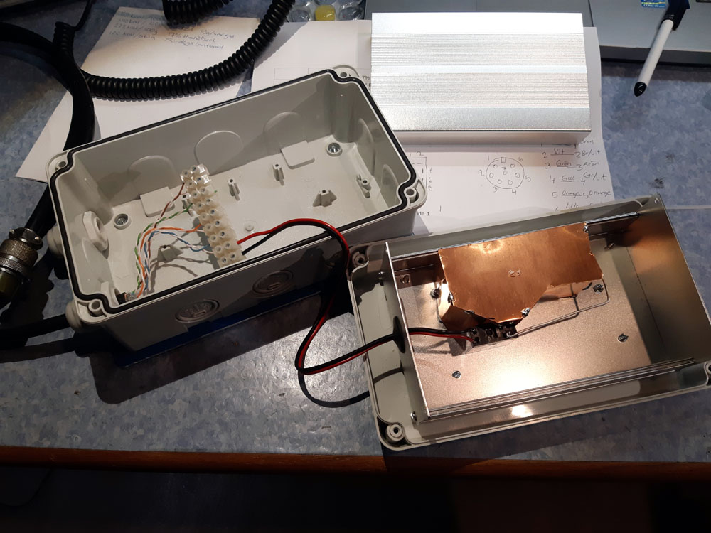 INDEX Senast uppdaterat 2024.11.04 Återanvänder den relä manöverbox som jag tidigare använt till min första DIY-Reläbox. ![]() YEASU kontrollbox / Relä manöverbox 2024.10.30 För att styra min DIY reläbox så måste jag ha en extra ledning ut till wibe-masten. Har ett kabelrör i marken, det är 40m långt, lånade en 80m lång glasfiberstav / rulle för detta, inga problem att trycka igenom fiberstaven, drog in en tvåledare / telefonledning (DL1000) som jag hadde färdigt hemma. ![]() DL1000 inskarvad vid husvägg / Kabelrör vid husvägg 2024.10.27 Uppdaterar min DIY-Relä box. I den första versionen använde jag ett växlande relä för att kunna växla mellan LANNABO L2 antennen och KELEMEN DP-1608040-H dipolen. I V.2.0. använder jag i stället två relän. Läs mera -->Här! 2024.10.13 Kopplar klart rotor och antennswitch, skarvar styrkabel. ![]() 'AMERITRON RCS-4' fjärrswitch / Ny Antennrotor 'YEASU G-2800DXC' på plats Justerar in 'norrläge' hissar upp masten i sin fulla längd, provkör lite under e.m. kväll, allt verkar att fungera som tänkt. ![]() Skarvbox för styrkabel vid mastfot / Husvägg ![]() Skarvbox för styrkabel vid husvägg / Dax att provköra lite... 2024.10.06 Ny rotor 'YEASU G-2800DXC' på plats, använde ett spakblock för att lyfta ner 'LANNABO L2' antennen, det fungerade riktigt bra. Ny antennswitch 'AMERITRON RCS-4' monterad och provad, ny styrkabel indragen i markröret. Återstår att skarva på rotorkabeln och montera tillbaka kontakter. En radio-kompis (Roger BD-12) kom på besök medans jag skruvade som bäst, han tog några bilder, notera den snygga fallskydds-selen, den är ny inför detta jobb. (Har tidigare alltid haft tillgång till klättersele via jobbet, det har jag inte nuförtiden) ![]() Rotorbyte pågår... Som man kan se på bilden här nedan så är 'EMOTATOR 1103mxx' ingen liten 'skrutt' rotor, 400kg max i vertikal last, 2.5m2 max vindyta och 10000kg bromskraft. ![]() Gammal / ny rotor / Ny rotor på plats 2024.10.03 Förbereder utbyte av min EMOTATOR 1103mxx antennrotor, en ny 'YEASU G-2800DXC' rotorn åker upp i dess ställe. Byter även styrkabel med kontakter och 'fjärr' antenn-växel. Byggställning på plats, använder ett spakblock för att lyfta ner Lannabo L2 antennen, låter antennen ligga kvar över räckena på byggställningen medans rotorn byts ut. ![]() Byggställning på plats / Ny 'YEASU G-2800DXC' rotorn 2023.10.08 Har nu kopplat in alla antenner efter sommarens måleriarbeten. Ordnade lite med mina antenn-switchar. 2021.06.27 Har införskaffat ytterligare en WIBE teleskop mast. Den 'nya' masten är en 'TYPE TM 150-25-5.9' - Masten är lite smutsig men i riktigt bra skick verkar det som. ![]() WIBE mast nr#2 - KELEMEN DP-1608040-H - 2020.04.30 Justerar stående våg på min KELEMEN DP-1608040-H dipol. justerar på 80M sektionen, så påverkas även 160M bandet. På 40M bandet är SWR redan bra. Kortar ner 80M delen genom att linda ihop 142cm av antenntråden vid bortre änden av 80M sektionen (Vid 80M trap's) - Genom att linda ihop antenntråden (Se bilder nedan) slipper jag att kapa av tråden. Måste dock korta betydligt mer än beräknat. ![]() Avkortning Enl. beräkning så skulle jag korta 1,09M (300/3,51)/4-(300/3,7)/4 - Men innan SWR hamnade rätt på 3,7MHz var jag tvungen att korta 40cm till. ![]() SWR på 30M Bandet / 40M bandet Antennen ska inte fungera på 30M bandet, men i praktiken så gör den det med SWR under 1:2, på övriga band är SWR under 1:1,5 ![]() SWR på 80M Bandet / 160M bandet - LANNABO L2 - 2020.02.29 Tog några vinterbilder på Wibemasten och Lannabo L2 antennen. Bra konditioner mot Asien på morgonen, några JA stationer körda på FT8 / 20M med antennen riktad i N/NO (ca. 40-50°) ![]() Lannabo L2 i vinterskrud / Skärmklipp från webcam 2020.01.07 Har monterat ett extra antenn fäste (Utstick) för en KELEMEN DP-1608040-H (By WIMO), trapped dipol för 160, 80 & 40meter. Fästet är skruvat i rotorns undre fäste. ![]() Upphissad ca 17m / Detaljer, bl.a. fäste för dipol 2019.12.15 Fäster toppstag (Vita) och mellanstag (Blåa) för att kunna prova att hissa masten, vevade upp den ca 12 meter tills vita markeringar kom upp på mellansektionen. Var tvungen att sluta hissa för att kolla vad dom betyder? - Visade sig att vara en markering som talar om att man nu ska sträcka dom röda 'autostagen' för att få toppsektionen att gå upp när man fortsätter att veva. Jag tänker inte använda toppsektionen, så jag har skippat dom röda 'autostagen'. ![]() Upphissad ca 12m / Topstag på plats Som jag förstår det hela så är det bara att veva på tills dom vita triangel markeringarna kommer upp, då är masten i sitt toppläge (Minus topp sektionen) - Total höjd med rotor och topprör borde då var ungefär 16,5 meter. 2019.12.09 Har även stagsats (M8721-210110) som hör till teleskopmast (M1237-853711), tänker använda 'vita' och 'blåa' staglinor med sträckare. Har permanent monterade stag i botten sektionen, så dom svarta stagen behövs inte. ![]() Stagsats M8721-210110 a