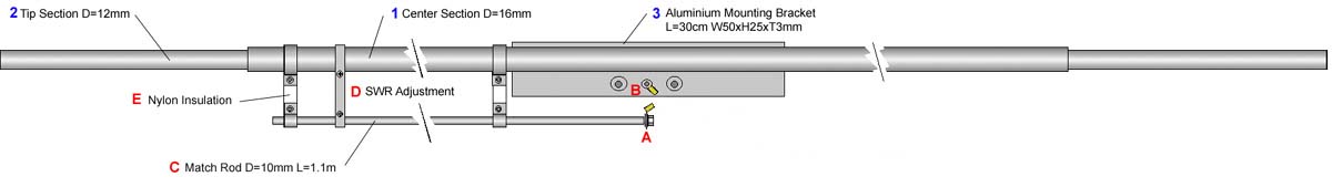 D. SWR Adjustment plates,- made out of two pcs. of 3mm aluminium about 100 x 25mm,- attached between Dipole element and gamma-rood with two screws and nuts,- so it can be moved for SWR adjustment.