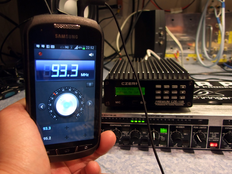 Sändaren FM Sändaren CZERF CZE-15B är en mycket kompakt, men kompetent sändare. Den har bl.a. övervakning av temperatur, stående våg (SWR) uteffekt, utstyrning (Modulation) o.s.v. Uteffekten är justerbar i 100mW steg från 300mW till 15W, detta är särskilt bra om sändaren framgent ska kunna mata ett separat utgångssteg. På sändarens bak panel hittar man en USB anslutning för fjärrstyrning, alla funktioner kan kontrolleras / styras via programvara i PC-Dator (Windows) ![]() CZERF CZE-15B Tekninska krav på sändaren hämtade från PTS.se[R3] (CZERF CZE-15B stöder samtliga dessa standards) 1. Sändaren ska uppfylla de tekniska kraven i standarden ETSI EN 302 018-1 v.1.2.1 eller motsvarande. 2. Vid stereosändning ska pilottonsystem enligt Rec. ITU-R BS.450-3 sektion 2.2. användas. 3. Vid sändning av programinformation ska system enligt Rec. ITU-R BS.643-2 användas. 4. Deviation hos utsänd signal får inte överstiga +/- 75 kHz enligt Rec. ITU-R BS.412-9 sektion 2.5.1. 5. Den fullständiga multiplexsignalens effekt får inte överstiga referensnivån 0 dBr som den definieras enligt Rec. ITU-R BS.412-9 sektion 2.5.1. 6. Sändarantennens diskriminering i vertikalplanet ska uppfylla krav enligt tabell nedan.