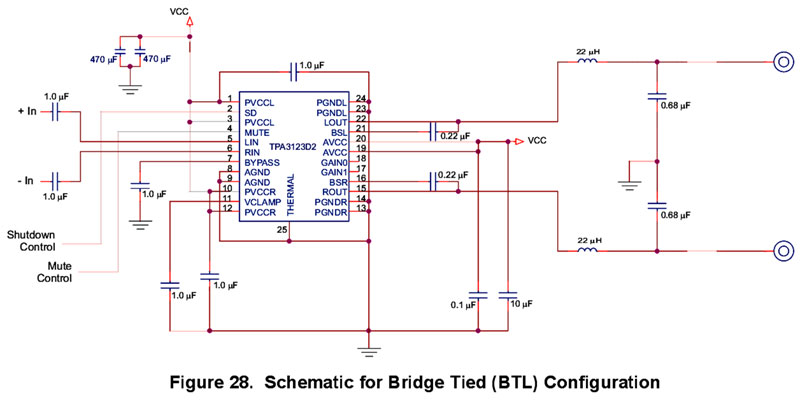 När det kommer till kretslösning för denna typ av förstärkare, är normalfallet att tillverkaren i princip följer krets tillverkarens 'exempel' kopplingar.