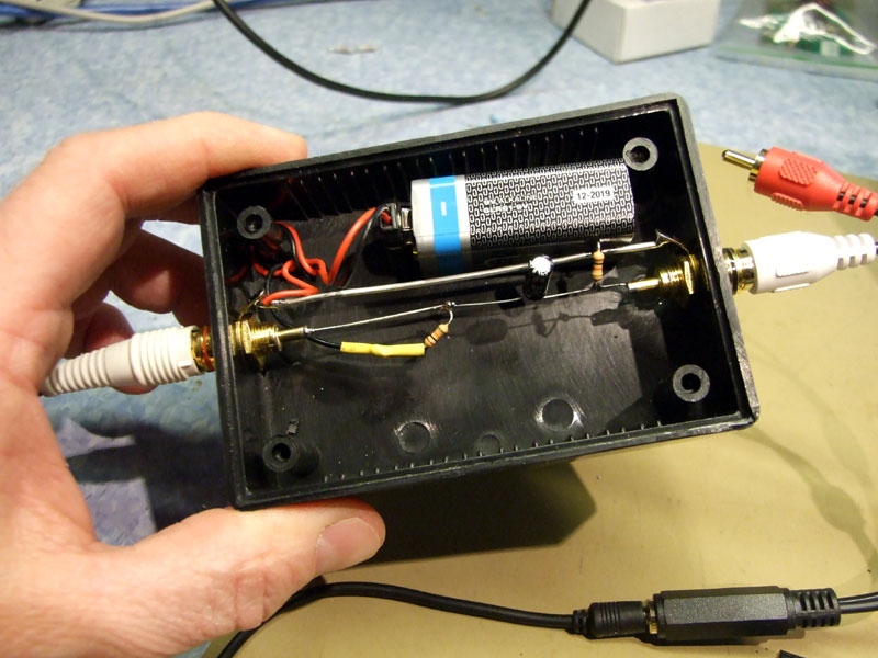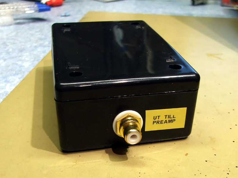 ![]() Virtins Multi Instrument v.3.4 (LIN) Notera att varken utnivå eller mikrofon nivå har kalibrerats, det blir nästa steg i projektet. Som jämförelse, en RTA kurna från samma högtalare testad med XTZ Room Analyzer 1.0 - Notera att denna kurva är logaritmisk (Virtin kurvan ovan är linjär) ![]() XTZ Room Analyzer 1.0 (LOG) 2015.01.17 Har inte uppdaterat sidan på länge, RTA mät projektet har inte stått stilla helt, bygget av mätmikrofonen är ganska enkelt. Lite modifiering av själva mätkapseln och sedan ett någorlunda bra sätt att montera kapseln på. ![]() DIY Mätmikrofon i närbild Mikrofon kapseln är fästad med hjälp av en bit krympslang i ena änden av ett 140mm långt aluminium rör D8mm/d6mm, i andra änden sitter en XLR hane. Röret har helt enkelt skruvats fast med hjälp av XLR kontaktens kabelavlastning. ![]() DIY Mätmikrofon / Power injection box Inkoppling av mikrofon kapseln och inkoppling av spänningsmatning framgår av skiss 'C' hämtade från LINKWITZ-LAB[R4] - Även den nödvändiga modifieringen av själva mikrofon kapseln framgår. ![]() Skiss: Modifiering av mikrofonkapsel ![]() Power injection box Använder vanliga phono kontakter på 'intector' boxen. 9V batteriet kopplas in när mätmikrofonen kopplas in i sin kontakt 'MIC-IN' (Kretsen sluts) - därför behövs ingen strömbrytare. ![]() Mätmikrofoner 2014.07.18 Beställde just 2st Panasonic WM61A Electret kapslar från Svanalder.se[L2] - Tanken är att mikrofonkapseln ska användas med en förförstärkare kopplad till dator med programvaran 'Multi-Instrument v3.3' från virtins.com[L2] Och TrueRTA[R1].