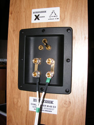 2010.03.15 Använder just nu Dynavoice högtalarna för att testa våran 'Nya' stereo förstärkare, en 12år gammal NAD 306 nere i maskinhallen... 2010.03.10 Här kommer en lite reflektion om det här med att 'spela in' högtalare. När vi packade upp M65orna och kopplade in dom första gången så tyckte vi omedelbart om det vi hörde, FANTASTISK! (Första reaktionen) - Nu ca: tre månader senare tycker vi att dom låter ÄNNU MERA FANTASTSKT!!!. Vi tycker oss även märka att högtalarna låter bättre om man börjar med att spela lite hårdare, innan man går över till mjukare musik. (Värmer upp dom liksom?) Fundering: Beror detta helt enkelt på dåligt material i högtalar elementens upphängningar? (Gummikanter) - Det är helt enkelt FÖR hårt (Plastigt) material. Innebär detta även att vi kan förvänta oss att högtalarna kommer att låta sämre allt eftersom materialet åldras och hårdnar (Mjukgörare i plast material avdunsar normalt med tiden) 2010.02.01 Sammanfattning Nu har vi provat, lyssnat, vänt och vridit på högtalarna, och vad har vi då kommit fram till kan man undra? Utförande: Bra bygge, kanske lite klena i stommen men med den interna stagningen är lådan ändå tillräckligt stabil för att hålla emot dom värsta resonanserna. Design mässigt är lådan helt OK!, 'lagom' snygga vilket gör att dom antagligen passar in hos dom flesta. Bygg kvaliten är mycket bra. EX modellen som vi har,- ger lite 'extra' rent utseende mässigt. Ljudet: Kontrollerad & Precis bas. Klar och balanserad över hela mellan registret. Tydlig och klar diskant, hänger med även när det spelas väääldigt högt. (Läs mera nedan) Ljudet: Tillägg 2011.05.03 - Nu har vi spelat i över ett år med M-65'orna och vi är fortfarande MYCKET nöjda. Har även passat på att lyssna på några andra högtalare av 'bättre' märke. Vist finns det högtalare som låter både bra och annorlunda, men eftersom vi nu har lyssnat in oss på M-65'orna så blir jämförelserna helt orättvisa till M-65'ornas fördel eftersom våra öron nu också är 'Inspelade' med dom. Helhet: Med ett pris på 2695kr paret inkl. frakt så hamnar dom helt klart på 'PRISVÄRT' sidan. Då vi inte är några fullfjättrade audio-filer så kan vi leva med dom små brister som vi stött på. Helhet: Tillägg 2011.05.03 - M-65'orna är helt klart något att hänga på högtalarkablarna! - Dom är 'helgjutna' musik förmedlare rakt igenom! - Tidigare hadde jag en fundering om materialet i bashögtalarnas kanter, vi har efter ett drygt år's flitigt spelande inte märkt några problem med dessa, oron kvarstår dock... ![]() DYNAVOICE Challenger M-65 EX Slutsats Bra högtalare för lite pengar. Naturligtvis gäller 'naturlagarna' även för högtalare, lägger man ut mera pengar så får man mera, är man rädd om pengarna så får man nöja sig med mindre... Därmed inte sagt att man alltid blir 'lurad' om man som oss inte vill slänga ut hur mycket pengar som helst, tvärt om! Man kan hitta 'russinen' i kakan och dessa högtalare är helt klart ett 'fynd' i sin prisklass. Vi är helt nöjda. En 'normal' användare hade kanske bara lyft in högtalarna och varit nöjd med detta. Nu kanske vi inte är helt 'normala' och har därför även försökt att stöka runt med både möbler och placeringen av högtalarna, plus att vi har 'modifierat' lite både inuti och utanpå för att 'förbättra' helhets intrycket både estetiskt och ljudmässigt. Dynavioce M-65 Ex var för oss ett MYCKET bra val, både för musik lyssning och hemmabio. Med lite mixtrande och trixande så har resultatet blivit lång ÖVER våra förväntningar. Notera att det är helt personliga reflektioner och upplevelser vi skriver om på den här sidan, dessa är inte några 'Expert' kommentarer / utlåtanden. Vi rekommenderar INTE att någon ska göra dom ändringar / Modifieringar som vi gjort och som beskrivs på denna sida, då dessa HELT SÄKERT gör att alla garantier som leverantören utställt OMEDELBART upphör. Våra tester och slutsatser kan INTE, och ska INTE tas för intäkt att samma eller motsvarande resultat eller upplevelse kan erhållas eller efterliknas någon annanstans eller av någon annan. Det fins 'spalt kilometrar' med inlägg och kommentarer om just denna högtalare. Läs även dessa trådar på olika forum, enklast är att göra en sökning på 'Dynavoice M-65' på t.ex. Google.com - drygt 11400 träffar just nu (2010.02.01) En av dom bättre diskussionerna hittar du på Testar 'Bi-Wire' koppling 2010.02.05 Testar att 'Bi-Wire' koppla högtalarna. Först kopplade jag bara in den ena (Högra) högtalaren med en extra kabel (tot 2st 2x 2mm²) och provspelade, ingen hörbar skillnad vid denna första provspelning. Har nu även kopplat 'Bi-Wire' matning till den andra högtalaren. Efter att ha kopplat ur den ena kabeln på båda högtalarna (Noga med att inte kortssluta den urkopplade kabeln) och monterat tillbaka byglarna,- provspelat och därefter åter avlägsnat byglarna och kopplat in den andra kabeln, samt upprepat detta ett antal gånger för att jämföra ljudet, kan jag fortfarande inte påstå att jag märker någon större skillnad. Ev. kan mellanregistret framträda lite tydligare, detta kan även vara ett 'hjärn-spöke' (Ren inbillning) då jag redan innan läst mig till att effekten skulle uppträda i just mellanregistret. Största behållningen med Bi-Wire kopplingen så långt jag kan förstå borde vara att den totala kabel arean nu har fördubblats. Då vi använder ganska korta kablar så var i.o.f. 2,5mm² area fullt tillräcklig redan innan. Kablar inom Audio området är ett 'Hett' ämne på många hifi/audio forum. På denna -->Sida beskriver jag våra erfarenheter inom området. ![]() 'Bi-Wire' koppling Om 'Bi-Wire' koppling Idén med 'Bi-Wire' är att dela upp högtalar strömmarna på två ledningar så att dom kraftiga strömmarna som ska gå till bas-elementen inte ska orsaka spänningsfall som i sin t