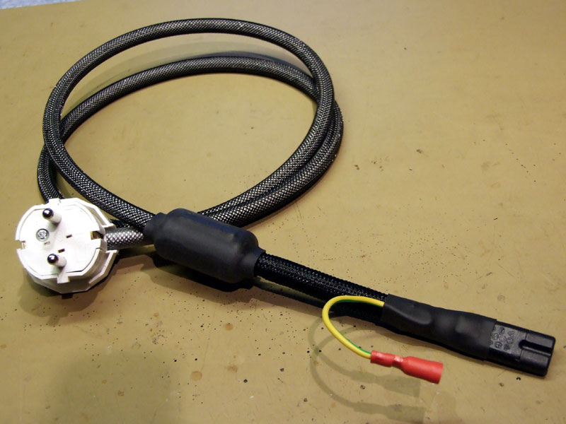 Använder skärmad el-kabel med 3x15mm2 ledare. Kabeln är inhandlad från RTK.se[L5] och kostar 29kr/m - Börjar med att kapa upp rätt längd, skalar och förtennar ledare, löder ihop skärm med den grön/gula jordledaren. ![]() Kabel med SCHUKO Typ F och IEC-320-C13 kontakt / IEC-320-C7 kontakt Trär över en svart PET-Fläta och avslutar i respektive ände med en bit krympslang, skruvar på kontakterna och sätter på en delbar järn ferrit. ![]() Tillverkar el-sladd med skärmad kabel 3G1,5/1,5 - IEC-320-C13 Tillverkar även skärmade el-kablar med std. IEC-320-C7 kontakt för CD/DVD spelare, skivspelare m.m. ![]() Rakskarvar och isolerar Använder begagnade IEC-320/C7 kontakter som jag klipper loss från återvunna kablar, rakskarvar och isolerar. ![]() Rakskarvar och isolerar / Isolerar med smältlim / krympslang