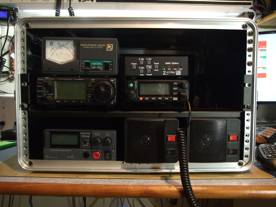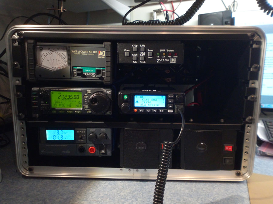 INDEX Senast uppdaterat 2019.02.26 Uppdaterad info om senaste versionen hittar du här! --> GoBox.v.3.0 Bygger ihop en portabel stationsplats för kommunikation. Tanken är att få en oberoende / självförsörjande enhet, den ska även vara lätt att transportera, att upprätta och att använda. På amatörradiobanden HF ska man kunna köra alla trafiksätt AM/SSB och digitala moder, Lokalt ska man kunna köra både analog och digital kommunikation (DMR) på 2M(VHF) och 70cm(UHF) amatör radio banden. 2018.03.08 Planerar att använda en s.k. bredbandsdipol (T2FD) med min GoBox, det innebär att den automatiska antenn avstämmaren blir helt överflödig. Samtidigt så inser jag att 'signalink' interface endast hanterar ljud IN/UT och PTT, kan m.a.o. INTE styra radion med ett sådant! - Det gör att man inte kan köra digital moder med hoppfrekvens t.ex. SWALE (Shortwave ALE) 2018.03.04 Go-Box'en funkar riktigt bra, även hemma i schacket, allt på plats, inkopplat och fungerande. Testar automat-avstämmning på 3674KHz inför morgonens SSA bullentin. ![]() Testar ATU / Kartläsarlampan i närbild Passar även på att prova USB ladd-uttaget på frontpanelen. Har nu bara kvar att fixa antenn ingångar och att hitta 2st fläktar som bullrar lite mindre. Har även en fundering på att ordna inkoppling av hörlurar om man vill använda Go-Box'en i bullriga miljöer, eller om man inte vill störa sin omgivning. ![]() Testar 5V USB ladd-uttag 2018.03.02 Nu är Go-Box'en så gott som klar, monterade och kopplade in boxens 'kontroll-panel' - På kontrollpanelen sitter en LED-Lampa modell kartläsarlampa, ett dubbelt USB mobil ladd-uttag och ON/OFF brytare för belysning, fläkt och ladd-uttag. ![]() Go-Box så gott som klar! 2018.02.26 Monterade 'rätt' antenn-tuner, det är en LDG AT-100Pro2 inhandlad från Limmared.nu[L2] (Den LDG Z-11Pro som syns på en del bilder är lånad) ![]() Alla apparater på plats och igång 2018.02.25 Påbörjar slutmonteringen av min 'GoBox' under helgen. Kapar ner djupet på 2st svarta 19" std. rack hyllor. Dom blir ca 22cm djupa (Se bild) - Monterar HF-Radio, nätaggregat, PWR/SWR instrument och antenna-tuner med hjälp av 15mm breda lastremmar(Se bild) ![]() Montage av apparater / Baksida Den övre hyllan monteras så högt som möjligt (Upp&Ner?) - Under den monterar jag PWR/SWR instrument och antenn avstämmning med 15mm breda lastremmar, 1st per apparat. Dom grunda hyllorna gör att det blir väldigt öppet på baksidan av apparaterna för ledningsdragning & inkoppling. På ovansidan av den nedre hyllan monterar jag HF radio och VHF/UHF/DMR radio, på undersidan monteras nätaggregat och 2st högtalare. ![]() Baksida / Testkör Tillverkar en bakpanel av plåten som blev över när jag kapade ner hyllorna. På bakpanelen monteras 2st 80mm fläktar, el-intag för 240V/AC och 13,8V/DC - Den senare används vid batteridrift (+Solceller) - På bakpanelen sitter även 3st antenn ingångar HF1, HF2 & VHF/UHF. 2018.02.23 Har påbörjat projektet med 'insamling' av material och utrustning. Själva stationsplatsen monteras / transporteras i ett begagnat 6HE 'Rack Case' från Thomann.de[L1] - Utrustningen drivs med ett sadelta 13.8v max 30A nätaggregat alt. från batteri / solceller. ![]() 'MockUp' montering (Test) av GoBox / Tilltänkt batterilåda Beskrivning Alla ingående delar är mer eller mindre 'standard' delar, en del är begagnade / återvunna delar från 'junkbox' - Fläktar, DC terminaler, rack-hyllor och själva rack-lådan har tidigare haft andra uppgifter att fylla. Använder vanliga grejer för 'Bil-EL' när jag koppla all 13,8V DC spänning inne i lådan, det är ringkabelskor, flatstiftshylsor, USB ladduttag, säkringshållare, säkringar och 4mm2 el-kabel. För HF (Kortvåg) används en ICOM IC-706mk2 Not 1 - Antennavstämning behövs inte när man använder en bredbandsdipol Not 2 - DigiMod 'SWALE' använder hoppfrekvens, en antennavstämning hinner inte avstämma vid varje frekvenshopp.