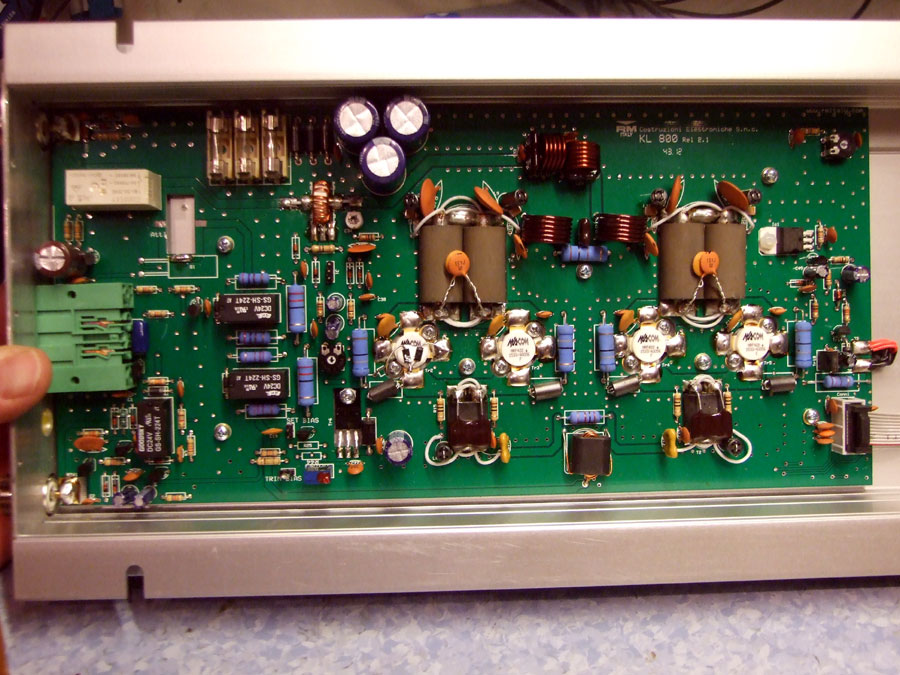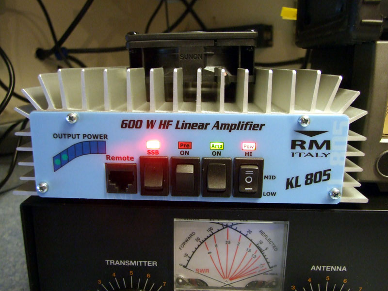 2016.07.05 Fick hem slutsteget idag, packade upp det, allt är med och verkar att vara helt och fint. Beställde slutsteget från England 2016.06.25 via eBay, säljare 'moonrakerukltd' (www.moonraker.eu) - Leveransen tog m.a.o. 10 dagar. Väntar på ett switchat 24V/33A industri nätaggregat från HongKong, även det beställt via eBay. Kan inte prova slutsteget innan nätaggregatet kommer, leveranstid är angivet till 'Jul 13, 2016 - Aug 16, 2016' så det kan bli att vänta ett tag till... Har även inhandlat en begagnad antenn avstämning 'MFJ-989D' för att kunna matcha upp mina antenner för att inte riskera utgångs transistorerna på slutsteget. Beskrivning ![]() RM-Italy KL-805 Front / Bakpanel Slutsteget har 4st MRF422[R4] HF/NPN transistorer. Den ska enligt databladet kunna hantera max 150W per transistor. Det är antagligen därför tillverkaren anger max uteffekt 600W (AM/FM), med lite säkerhetsmarginal kan man antagligen köra maximalt just under 500W uteffekt (AM/FM) Enl. tillverkaren ska slutsteget även ha skydds funktioner för överhettning, hög ståendevåg samt fel polarisering av drivspänning. Vidare så ska utgången även vara försedd med ett lågpass filter <30MHz - Filtret ska förhindrar splatter på högre frekvenser, kommer ändå att använda mitt Kenwood LF-30A filter efter slutsteget. ![]() RM-Italy KL-805 Invändigt / Närbild MRF422 Har tidigare även provat HLA 300 V PLUS (SOMMERKAMP SLA-300) från samma tillverkare. HLA/SLA-300 har 4st SD1446 transistorer i slutsteget, och ger enl. tillverkaren betydligt lägre uteffekt (300W AM / 600W SSB) - fungerade i övrigt mycket bra!