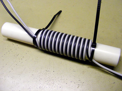 ![]() Bifilar windings on 32mm PVC Tube - Click on image ta enlarge - Making the antenna - I'm using Swedish military DL-1000 Telephone wire, This is a very strong and lite weight wire with 4x piano-wire parts and 4x cu parts. The images show some simple means to make weather proof connections to the balun or balanced feed-line.