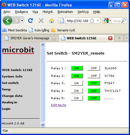 ![]() - Remote control - 2009.11.15 Now it's working fine! - Solved the network letancy problem. The problem was my Linksys/DD-WRT router uploading wx-data to my web-page. 2009.11.10 Tested the setup from my work today, got nice reports from SM and OH stations when everything is OK. At present time i'got two problems, one is network related and the other is HRD related. Problem 1 I got latency problems on my internet connection. The ping delay is suddenly up to 10x the normal delay in about 30 seconds, then returns to normal. (Se text dump) - I Don't know if it's on my home connection or on my internet connection @ work. I need to test from other remote site.- This is a text dump from ping test... Svar fr†n 172.16.92.11: byte=32 tid=17ms TTL=63 Svar fr†n 172.16.92.11: byte=32 tid=8ms TTL=63 Svar fr†n 172.16.92.11: byte=32 tid=14ms TTL=63 Svar fr†n 172.16.92.11: byte=32 tid=134ms TTL=63 Svar fr†n 172.16.92.11: byte=32 tid=983ms TTL=63 Svar fr†n 172.16.92.11: byte=32 tid=1280ms TTL=63 Svar fr†n 172.16.92.11: byte=32 tid=1390ms TTL=63 Svar fr†n 172.16.92.11: byte=32 tid=1471ms TTL=63 Svar fr†n 172.16.92.11: byte=32 tid=1483ms TTL=63 Svar fr†n 172.16.92.11: byte=32 tid=1457ms TTL=63 Svar fr†n 172.16.92.11: byte=32 tid=1471ms TTL=63 Svar fr†n 172.16.92.11: byte=32 tid=1492ms TTL=63 Svar fr†n 172.16.92.11: byte=32 tid=1502ms TTL=63 Svar fr†n 172.16.92.11: byte=32 tid=1499ms TTL=63 Svar fr†n 172.16.92.11: byte=32 tid=1481ms TTL=63 Svar fr†n 172.16.92.11: byte=32 tid=1504ms TTL=63 Svar fr†n 172.16.92.11: byte=32 tid=1499ms TTL=63 Svar fr†n 172.16.92.11: byte=32 tid=1480ms TTL=63 Svar fr†n 172.16.92.11: byte=32 tid=1480ms TTL=63 Svar fr†n 172.16.92.11: byte=32 tid=1324ms TTL=63 Svar fr†n 172.16.92.11: byte=32 tid=848ms TTL=63 Svar fr†n 172.16.92.11: byte=32 tid=495ms TTL=63 Svar fr†n 172.16.92.11: byte=32 tid=126ms TTL=63 Svar fr†n 172.16.92.11: byte=32 tid=15ms TTL=63 Problem 2 This is maby not a problem, when using the 'TX' button inside HRD i'got problems with the TX audio,- the problem is not present when using a 'real' external PTT button connected to the 'Control-RRC' AUX port. When using the original HM-36 microphone there is also no problem. ![]() Now also using external 'PTT' box 2009.11.09 Now trying out 'RemoteRig' from http://www.remoterig.com Setup and configuration is quite simple, i made the 'AUX-Cables' for my 'Radio-RRC' and the 'Control-RRC' according to the documentation. Made the 'Control RRC' cable with 8-pin mic connector, now i'm able to use the original HM-36 microphone, or the Heil-BM10 headset. The mic connector is 'compatible' with the 'original' connector on the rig. If it works on the rig it also works remote with the 'control-RRC' ![]() Made this 'remote index' on my remote laptop, make's it easy to connect from remote ![]() Control RRC @ work, connected and playing on 80 meter ![]() Radio RRC @ home ![]() RRC inside, high quality design and manucacturing Previous remote test... 2009.10.27 Trying to use the 'IP-Sound v0.57a' software instead of Skype. It's simple to install and use, got'it up and running in about five minutes. ![]() Screen dump from the 'IP-Sound v0.57a' software When using 'Skype' i got problems with the sound setting changing al the time, ewen when dissable al automatic settings. 2009.10.24 Using Wake-On-Lan function in my router to power up the Remote PC. This is a nice function, don't need to leave the remote PC on, it also saves energy. The function is NOT standard in the Linksys WRT54GL router it comes with the DD-WRT firware update ![]() Screen dump outcut of the WOL function 2009.10.24 Now also using a 'Microbit 1216' web-switch to power on the radio equipment. Start up procedure 1. From local PC, Access Remote site Router using standard webb browser 2. Avake Remote site PC with the Wake-On-Lan (WOL) function in the router 3. Access Remote site power switch using the local PC browser 4. Power the remote rig as desired*** 5. Open VoIP connection (Peer-To-Peer) from Local PC to Remote site PC 6. Startup the remote-rig control software on local PC *** IF the power amlifier is to be used, do not start it until the remote rig is on, desired band is selected and antenna tuning procedure is done. ![]() Web-Switch with connection cables (240V/AC) in standard ISO(Norm) case ![]() Web-Switch in case mounted on my shack wall ![]() Power supply for 2x Radio 1x Amplifier ![]() Screen dump from the web-switch interface The web switch control the radio equipment as follows Relay 1: Amplifier SLA-300 Relay 2: Radio 1 - ICOM IC-756proIII Relay 3: Radio 2 - YAESU FT-847 Relay 4: Coaxial Relay OFF=TH7DX ON=DB1217 Relay 5: Not used <-- Go Back! ![]() ©1999/2000/2001/2002 SM2YER Goran |