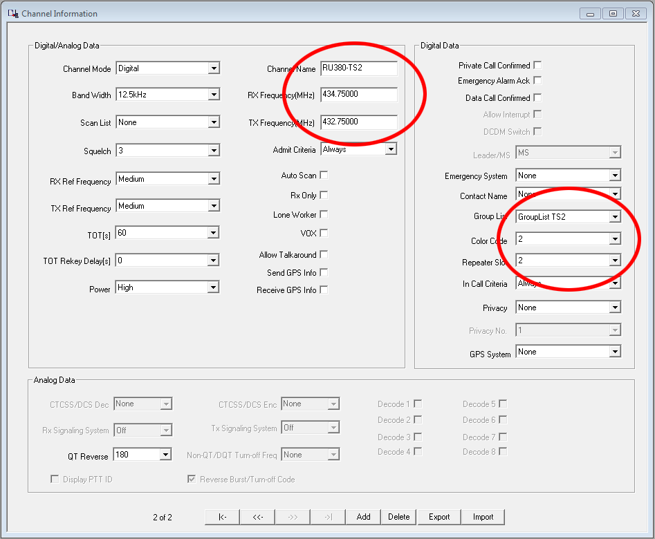 Förutom detta behöver jag även programvara, programmerings kabel samt en del radio data. Testar lite med prg. vara för TYT (Tytera) MD9600 - Fick inte prg. vara för RETEVIS RT90 att fungera (Borde fungerar ändå då dessa två i grunden är samma radio). Börjar med att välja vilken typ av radio du har, frekvensområden o.d. (Om du ändrar här efteråt, så nollställs allt du skrivit in i andra delar, Jobbigt!) - Fortsätt sedan med 'general' data = Radio ID, call o.s.v. General settings Så är det dax för kontakt listan, här lägger jag in en kontakt per talgrupp (TG) och direkt DMR-ID nummer om man vill ha direkt kontakt med någon. Kontaktlista Sedan gör jag en RX lista per Timeslot (två för varje repeater om man inte vill använda samma) - I 'Grouplist TS1' för TS1 lägger jag in dom talgrupper (TG) som ligger i TS1 på repeatern. RX Lista för TS1 I 'Grouplist TS2' för TS2 lägger jag in dom talgrupper (TG) som ligger i TS2 på repeatern. (Ser att jag missat att lägga in TG8 som är våran regionala talgrupp...) RX lista för TS2 Till sist skapar jag en digital kanal per timeslot för respektive DMR repeater, anger frekvenser, Timeslot, colorcode, callist o.s.v. Config för ch1/TS1 Config för ch2/TS2 Lägger även in en del lokala (Analoga) repeatrar, det är mera rakt på (Som förr i världen)