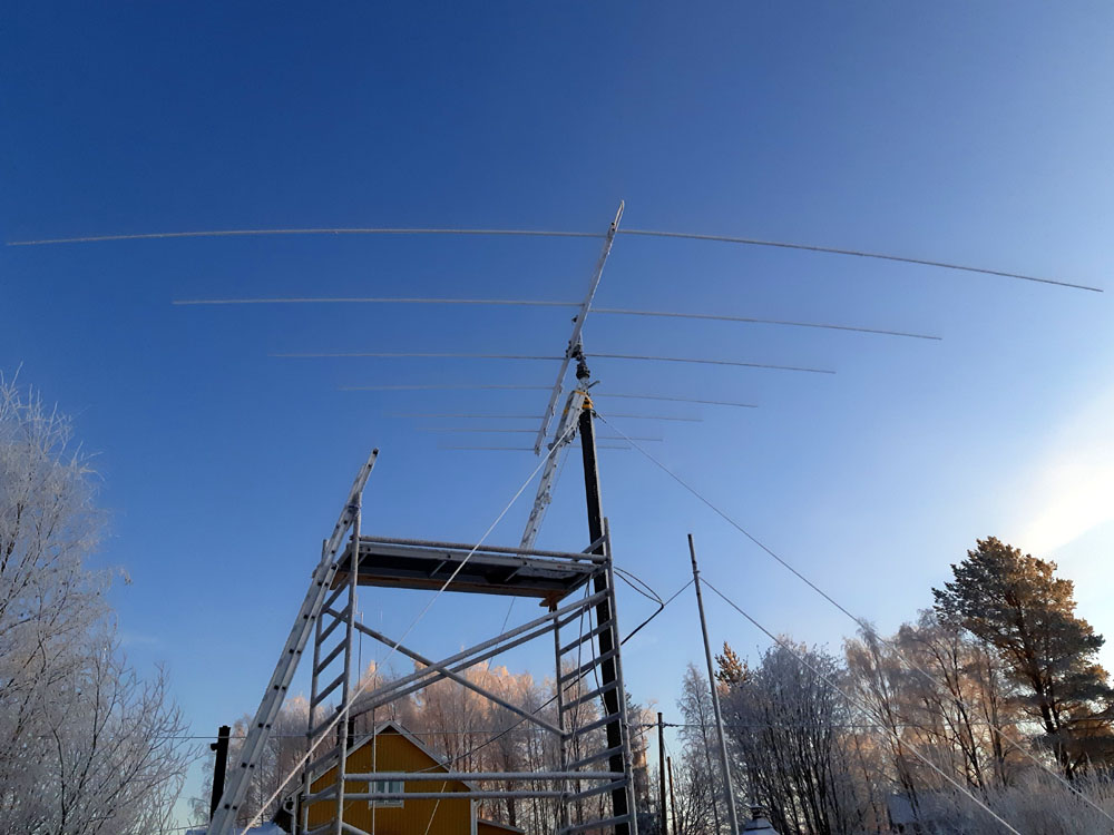 INDEX Senast uppdaterat 2024.11.04 Återanvänder den relä manöverbox som jag tidigare använt till min första DIY-Reläbox. ![]() YEASU kontrollbox / Relä manöverbox 2024.10.30 För att styra min DIY reläbox så måste jag ha en extra ledning ut till wibe-masten. Har ett kabelrör i marken, det är 40m långt, lånade en 80m lång glasfiberstav / rulle för detta, inga problem att trycka igenom fiberstaven, drog in en tvåledare / telefonledning (DL1000) som jag hadde färdigt hemma. ![]() DL1000 inskarvad vid husvägg / Kabelrör vid husvägg 2024.10.27 Uppdaterar min DIY-Relä box. I den första versionen använde jag ett växlande relä för att kunna växla mellan LANNABO L2 antennen och KELEMEN DP-1608040-H dipolen. I V.2.0. använder jag i stället två relän. Läs mera -->Här! 2024.10.13 Kopplar klart rotor och antennswitch, skarvar styrkabel. ![]() 'AMERITRON RCS-4' fjärrswitch / Ny Antennrotor 'YEASU G-2800DXC' på plats Justerar in 'norrläge' hissar upp masten i sin fulla längd, provkör lite under e.m. kväll, allt verkar att fungera som tänkt. ![]() Skarvbox för styrkabel vid mastfot / Husvägg ![]() Skarvbox för styrkabel vid husvägg / Dax att provköra lite... 2024.10.06 Ny rotor 'YEASU G-2800DXC' på plats, använde ett spakblock för att lyfta ner 'LANNABO L2' antennen, det fungerade riktigt bra. Ny antennswitch 'AMERITRON RCS-4' monterad och provad, ny styrkabel indragen i markröret. Återstår att skarva på rotorkabeln och montera tillbaka kontakter. En radio-kompis (Roger BD-12) kom på besök medans jag skruvade som bäst, han tog några bilder, notera den snygga fallskydds-selen, den är ny inför detta jobb. (Har tidigare alltid haft tillgång till klättersele via jobbet, det har jag inte nuförtiden) ![]() Rotorbyte pågår... Som man kan se på bilden här nedan så är 'EMOTATOR 1103mxx' ingen liten 'skrutt' rotor, 400kg max i vertikal last, 2.5m2 max vindyta och 10000kg bromskraft. ![]() Gammal / ny rotor / Ny rotor på plats 2024.10.03 Förbereder utbyte av min EMOTATOR 1103mxx antennrotor, en ny 'YEASU G-2800DXC' rotorn åker upp i dess ställe. Byter även styrkabel med kontakter och 'fjärr' antenn-växel. Byggställning på plats, använder ett spakblock för att lyfta ner Lannabo L2 antennen, låter antennen ligga kvar över räckena på byggställningen medans rotorn byts ut. ![]() Byggställning på plats / Ny 'YEASU G-2800DXC' rotorn 2023.10.08 Har nu kopplat in alla antenner efter sommarens måleriarbeten. Ordnade lite med mina antenn-switchar. 2021.06.27 Har införskaffat ytterligare en WIBE teleskop mast. Den 'nya' masten är en 'TYPE TM 150-25-5.9' - Masten är lite smutsig men i riktigt bra skick verkar det som. ![]() WIBE mast nr#2 - KELEMEN DP-1608040-H - 2020.04.30 Justerar stående våg på min KELEMEN DP-1608040-H dipol. justerar på 80M sektionen, så påverkas även 160M bandet. På 40M bandet är SWR redan bra. Kortar ner 80M delen genom att linda ihop 142cm av antenntråden vid bortre änden av 80M sektionen (Vid 80M trap's) - Genom att linda ihop antenntråden (Se bilder nedan) slipper jag att kapa av tråden. Måste dock korta betydligt mer än beräknat. ![]() Avkortning Enl. beräkning så skulle jag korta 1,09M (300/3,51)/4-(300/3,7)/4 - Men innan SWR hamnade rätt på 3,7MHz var jag tvungen att korta 40cm till. ![]() SWR på 30M Bandet / 40M bandet Antennen ska inte fungera på 30M bandet, men i praktiken så gör den det med SWR under 1:2, på övriga band är SWR under 1:1,5 ![]() SWR på 80M Bandet / 160M bandet - LANNABO L2 - 2020.02.29 Tog några vinterbilder på Wibemasten och Lannabo L2 antennen. Bra konditioner mot Asien på morgonen, några JA stationer körda på FT8 / 20M med antennen riktad i N/NO (ca. 40-50°) ![]() Lannabo L2 i vinterskrud / Skärmklipp från webcam 2020.01.07 Har monterat ett extra antenn fäste (Utstick) för en KELEMEN DP-1608040-H (By WIMO), trapped dipol för 160, 80 & 40meter. Fästet är skruvat i rotorns undre fäste. ![]() Upphissad ca 17m / Detaljer, bl.a. fäste för dipol 2019.12.15 Fäster toppstag (Vita) och mellanstag (Blåa) för att kunna prova att hissa masten, vevade upp den ca 12 meter tills vita markeringar kom upp på mellansektionen. Var tvungen att sluta hissa för att kolla vad dom betyder? - Visade sig att vara en markering som talar om att man nu ska sträcka dom röda 'autostagen' för att få toppsektionen att gå upp när man fortsätter att veva. Jag tänker inte använda toppsektionen, så jag har skippat dom röda 'autostagen'. ![]() Upphissad ca 12m / Topstag på plats Som jag förstår det hela så är det bara att veva på tills dom vita triangel markeringarna kommer upp, då är masten i sitt toppläge (Minus topp sektionen) - Total höjd med rotor och topprör borde då var ungefär 16,5 meter. 2019.12.09 Har även stagsats (M8721-210110) som hör till teleskopmast (M1237-853711), tänker använda 'vita' och 'blåa' staglinor med sträckare. Har permanent monterade stag i botten sektionen, så dom svarta stagen behövs inte. ![]() Stagsats M8721-210110 a